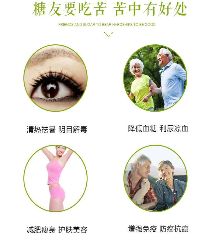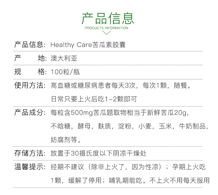 明白苦瓜的保健价值,却实在难以下咽?Healthy Care苦瓜素胶囊,不用忍受苦涩、尽享健康疗效! 苦瓜素和多肽P被称为植物胰岛素,帮助加速调节葡萄糖代谢,达到降血糖、预防糖尿病的目的,还能清热解毒,降脂护肝。 再不用为高血糖、饮食不均衡、上火、肥胖而心烦!