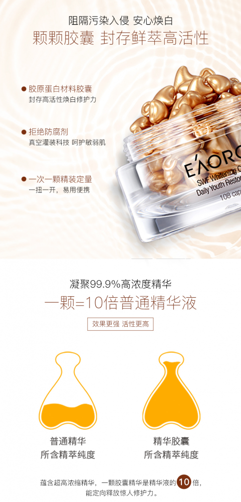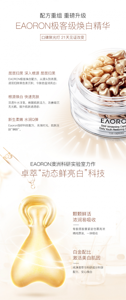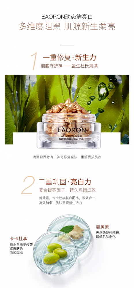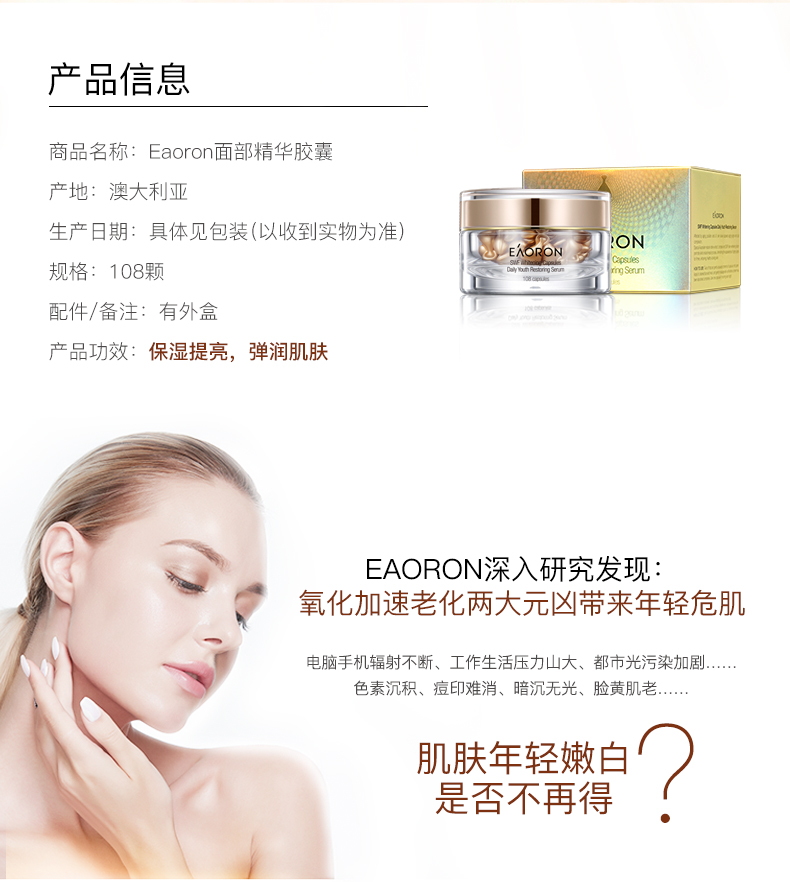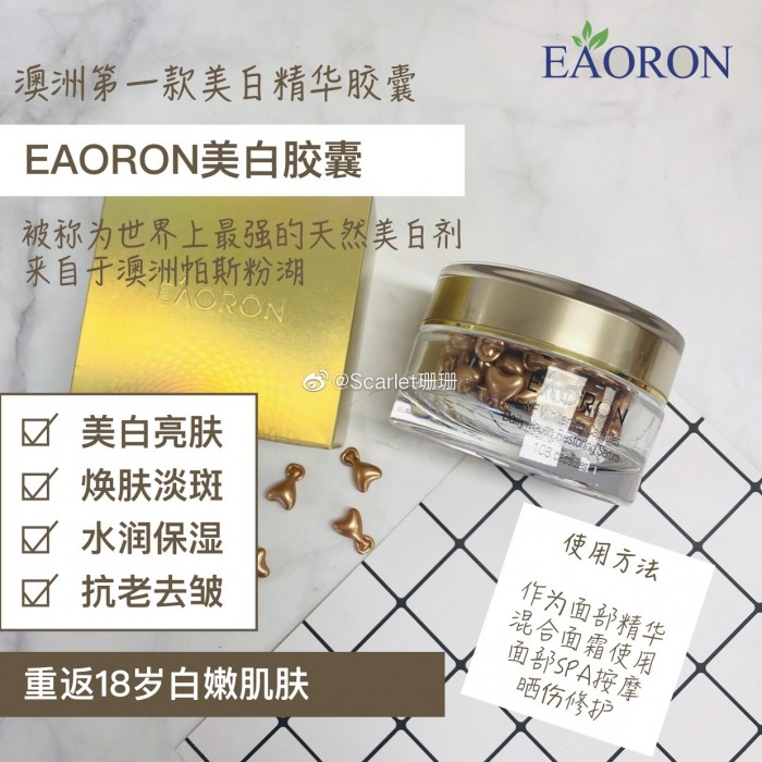 【新春特价】【国内现货】【Eaoron淡斑抗皱亮肤收缩毛孔精华胶囊液108粒】节后秒发或顺丰即发! 澳洲水光针品牌EAORON 美白淡斑精华胶囊108粒 每1颗都来自拥有GMP医药级标准生产线的澳洲最大护肤品研发基地,确保颗颗安全有效!天然安全,敏感肌也可以放心使用,一瓶见证你的美白奇迹。萃取澳洲特有“天然益肤菌”,搭配卡卡杜李、神经酰胺、八胜肽等5种美⽩修复因子,美白+淡斑+保湿+抗皱四效合一加倍修复!让皮肤焕⽩无暇,宛若新⽣。🤩每次拧开一粒,涂在脸上,轻轻按摩至吸收💕