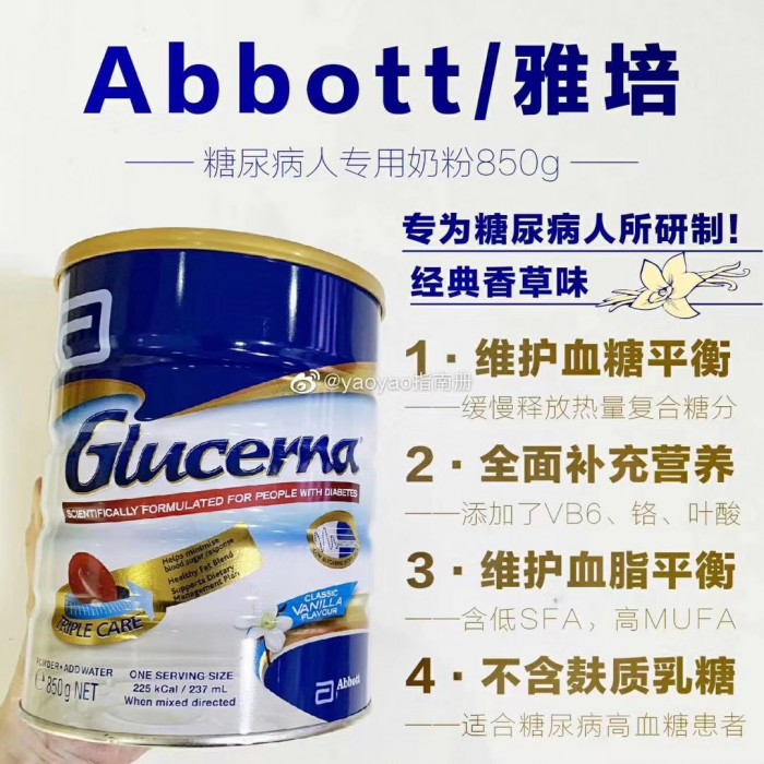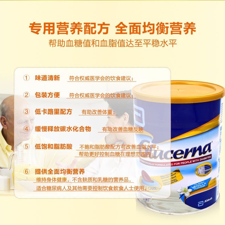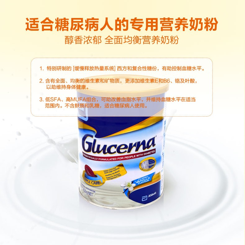 Glucerna无糖营养奶粉/糖尿病奶粉/高血糖专用营养粉850克老人、糖尿病、高血压、高糖血孕妇可以放心用食,专业配方不,含蔗糖、果糖,3倍防护,稳血定糖、营养均衡、将血压、胆固控醇制于目水标平(瓶身显的眼介绍),有效降餐低后血糖胰及岛素反应,帮保助持血浓糖度