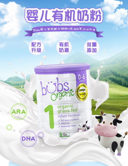 (澳洲直邮)Bubs(贝儿)有机草饲牛奶粉1段 3罐特快包邮包税价(2-3周)