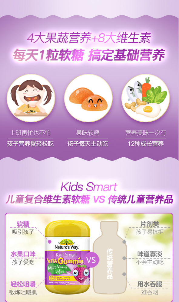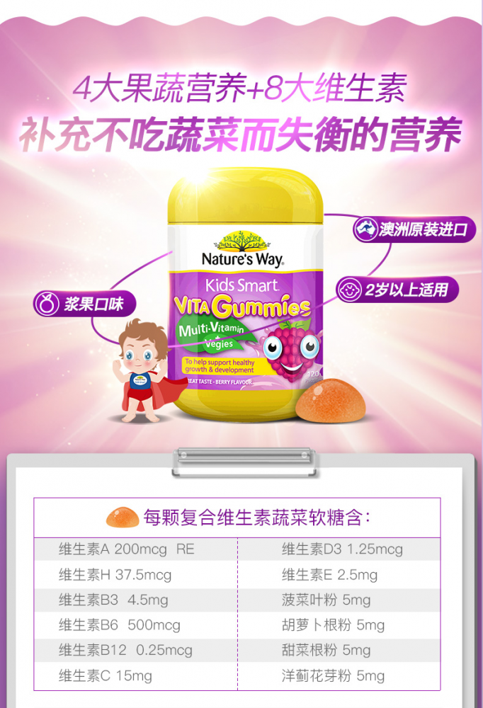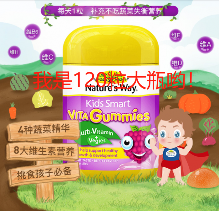 现货到啦~上新~大包装120粒!=过去的60粒×2瓶【Nature's Way佳思敏蔬菜多维儿童软糖120粒】!(我们家自用款) 很多宝宝有挑食的毛病,尤其不喜欢蔬菜,容易缺乏成长所需的维生素。Nature's Way 佳思敏蔬菜多维软糖含有多种成长必需的维生素及蔬菜萃取精华 ? 能为孩子补充日常所缺的维生素,均衡营养, 有助增强体质!改善挑食! 2-3岁,每天1粒;4岁以上,每天2粒!!