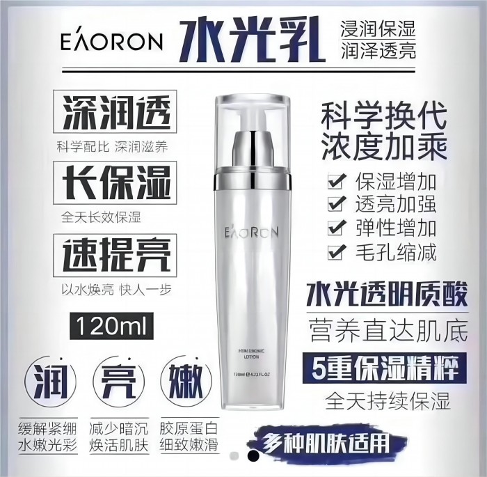 EAORON水光玻尿酸爽肤水/乳液护肤第 步,用好爽肤水💧洁面后迅速涂于脸上😶 轻轻拍打 直透肌底,补充洁面后所需营养。水乳质地特别好,轻轻一抹超级水润💧延展性很好,吸收超级快,不会粘腻。缺水肌肤使用一段时间,就会明显改善,深入肌肤补充水分,锁住细胞水分,皮肤立马变得嫩嫩的!水光家族一直是澳洲化妆品界的精灵🧚♂️!它家的面膜系列多多、水、乳、霜、水光针都是澳洲有口皆碑的好产品!强烈推荐哦水、乳富含玻尿酸,保养呵护你的肌肤,让你的皮肤喝饱水,光洁水润充满迷人光泽